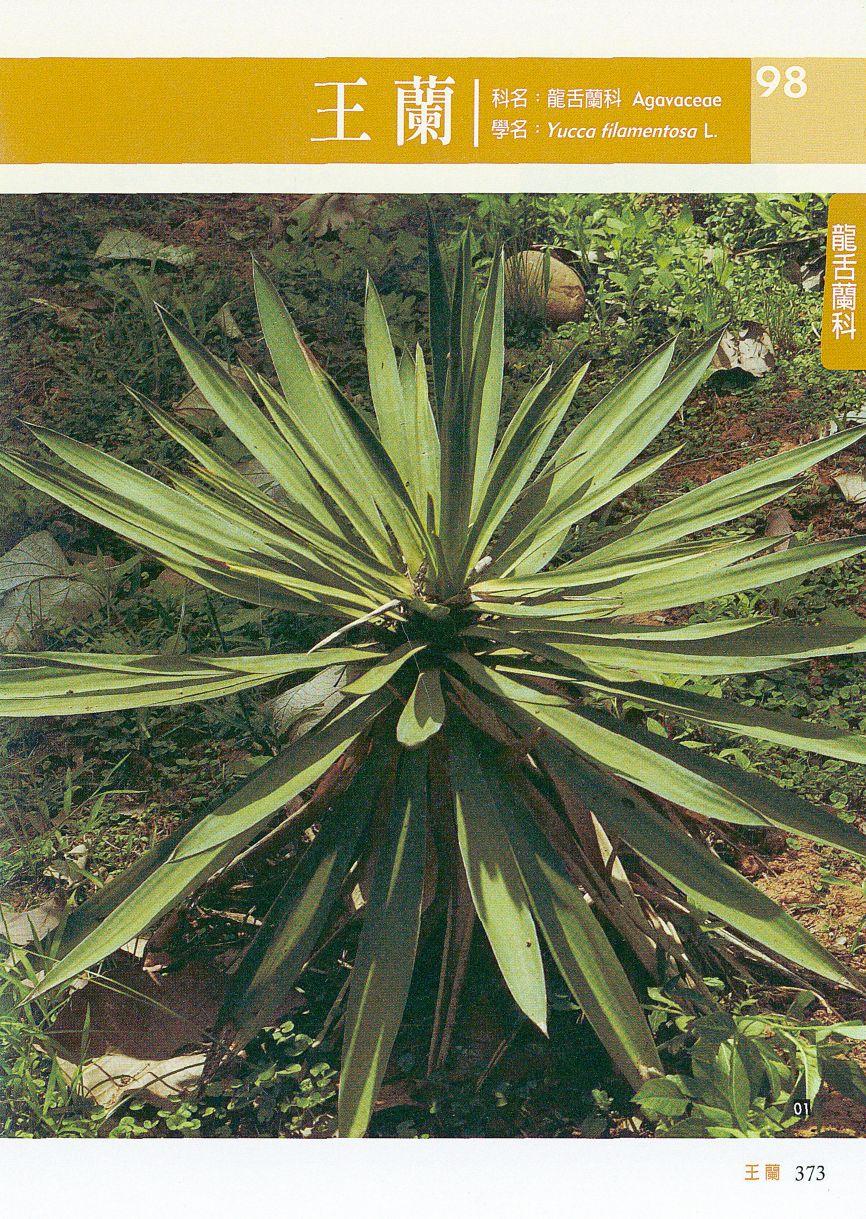 葉子 葉長60-75 cm,寬約5 cm,老時常具少數纖維狀絲線,幼時具少數脫落性銳齒,尖端短,剛硬而紅色。